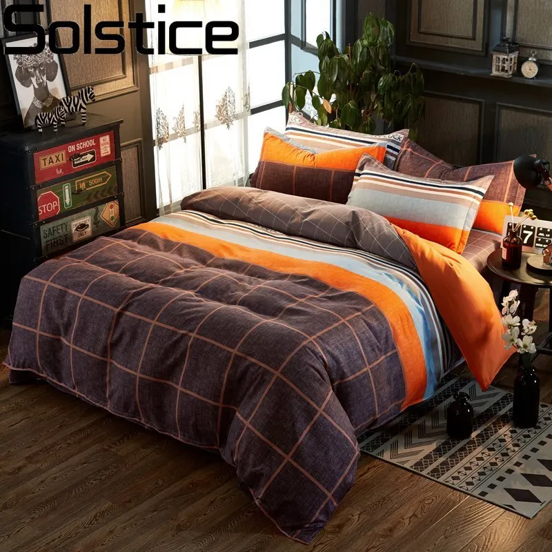 Order Chance of Solstice Home Textile King Single Bedding Sets Orange Brown Plaid Duvet Cover Pillowcase Flat Sheet